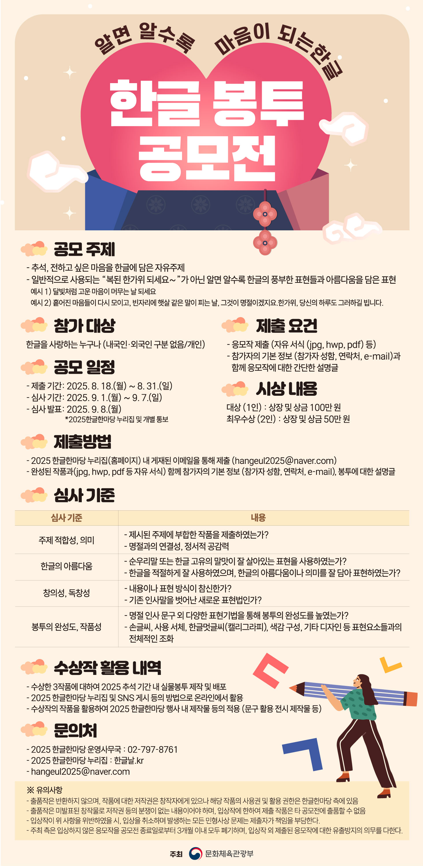 2025 한글 한마당 운영사무국 | E-MAIL : hangeul2025@naver.com | TEL : 02-797-8761Copyright © 2025 Ministry of Culture, Sports and Tourism. All Rights Reserved.